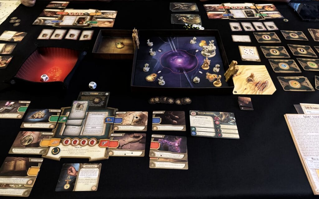 Voici le défaut le plus criant d’Arkeis : vous n’avez presque aucun choix stratégique pendant les parties. Vous fouiller, vous combattez, vous avancez. Le hasard du dé dicte trop souvent le résultat. Les ennemis ne bougent pas, ils sont scotchés à votre fiche : pas de placement tactique, pas de zonage, pas de synergie spatiale. Certains joueurs ont comparé cela à un jeu de cheminement automatique où l’on avance de salle en salle en espérant que le dé soit clément. Pour un jeu d’archéologues, on s’attendait à des énigmes, des dilemmes moraux, des puzzles. À la place, on combat des scorpions. C’est frustrant.