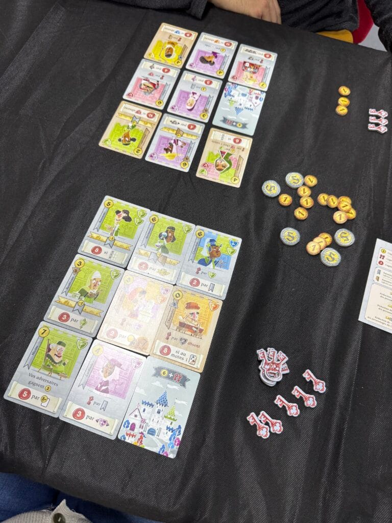Voilà le défaut récurrent : le décompte final est laborieux. Chaque joueur doit calculer neuf cartes avec des conditions différentes (« Compte tes boucliers rouges dans cette ligne », « Multiplie tes paires violettes/oranges par 4 », « Additionne tes cartes Château »). À quatre ou cinq joueurs, comptez 5 à 7 minutes de calcul silencieux où tout le monde griffonne. Ça casse net le rythme addictif du jeu. Une app compagnon ou un mode de scoring simplifié aurait sauvé la mise.