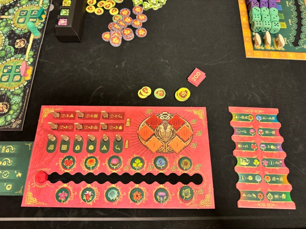 Vous incarnez un druide parcourant une forêt mystique composée de neuf tuiles modulaires. Vous lancez treize dés en début de partie (valeurs fixées définitivement), puis vous les placez un par un sur des sanctuaires pour activer des actions. Le piège diabolique : chaque dé coûte sa valeur exacte en provisions. Ériger des menhirs, récolter du gui, progresser sur dix pistes de scoring différentes… Le joueur le plus prestigieux l’emporte.