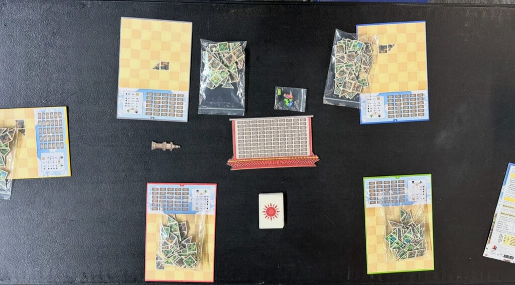 - Fin de Manche et Préparation de la Manche Suivante: On défausse les 4 cartes « Tuile Ville » utilisées pendant la manche. On désigne le premier joueur pour la manche suivante. En général, il s’agit du joueur qui a le plus de points, ou on suit un ordre précis en cas d’égalité. Puis, on prépare le tour suivant en révélant 4 nouvelles cartes « Tuile Ville ».
